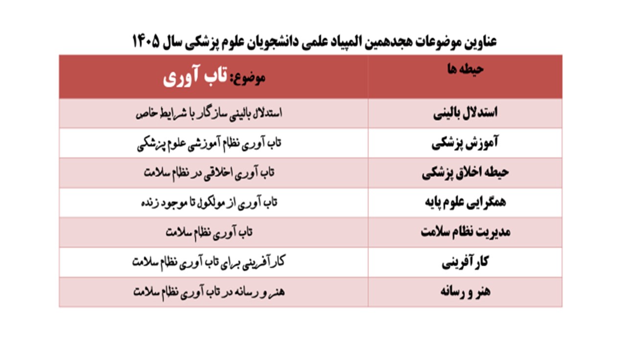 همانگونه که مستحضرید المپیاد علمی عرصه ای برای رقابت علمی دانشجویان مستعد علوم پزشکی است ونقش موثری در کشف استعدادهای برتر جوانان این مرز و بوم دارد و بی شک این مهم بدون زحمات بی شائبه و خدمات ارزشمند دست اندرکاران محقق نمی شود. ضمن تشکر از همکاری آن دانشگاه در خصوص این امر مهم، حسب تصمیمات متخذه در شورای سیاستگذاری و کمیته فنی المپیاد علمی، موضوع تاب آوری جهت هجدهمین المپیاد علمی دانشجویان علوم پزشکی در سال ١٤٠٥ در نظر گرفته شده است. همچنین بر اساس موضوع اصلی تاب آوری عناوین ذیل بعنوان موضوع اختصاصی برای هر حیطه نیز مشخص گردیده است. مقتضی است دستور فرمائید هماهنگی های لازم جهت اطلاع رسانی به کلیه دانشجویان شرکت کننده در این دوره از المپیاد علمی آن دانشگاه بعمل آید.